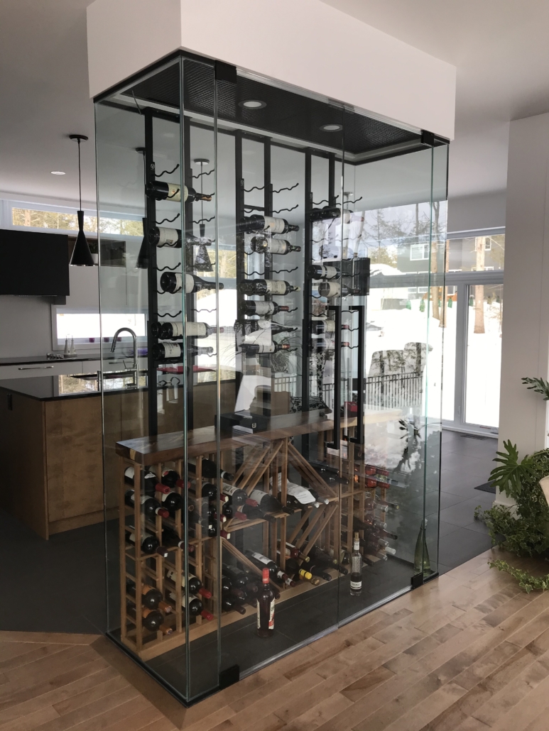 Que vous choisissiez une unité en verre complet, 3 côtés de verre et un fond miroir ou que votre système a seulement besoin d’être fermé à l’aide de portes vitrées. Système réfrigéré ou seulement une unité pour montrer votre collection de bouteilles, notre équipe est disponible pour vous aider à concevoir votre projet! Différents motifs de verre s’offrent à vous afin de combler vos attentes en ce qui a trait au look voulu.